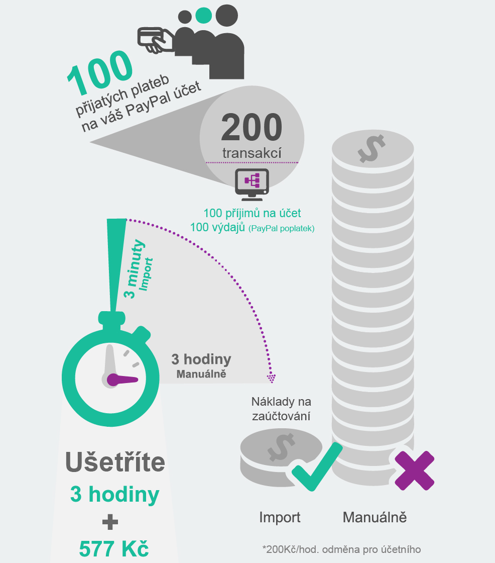 Každá platba, přijatá přes většinu platebních bran (např. PayPal), vyžaduje zaúčtování jednoho přijmu a jednoho výdaje (poplatek). U 100 přijatých plateb v našem příkladě se tedy jedná o 200 účetních transakcí.