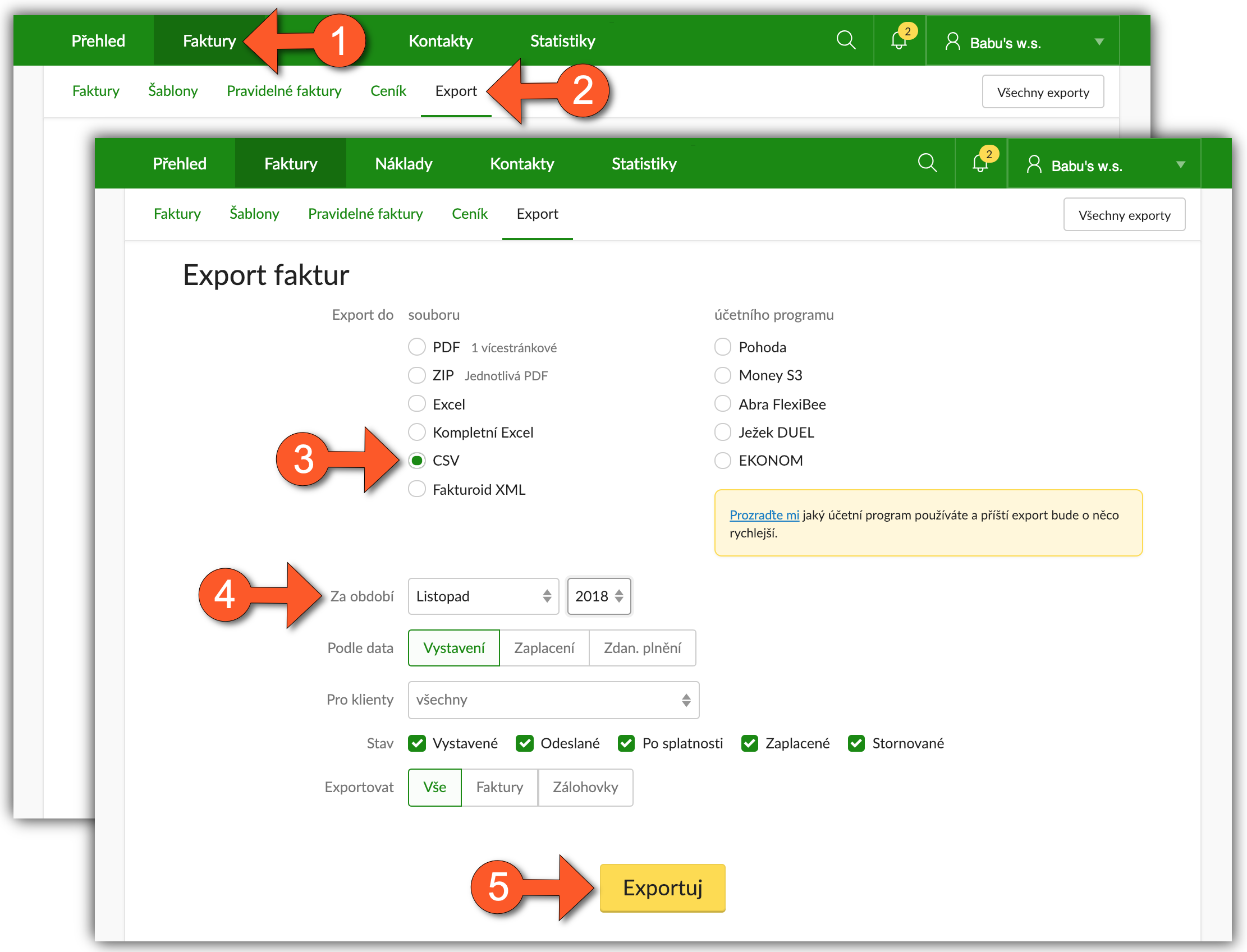 Vytváříme výpisy ve formátu CSV, ABO / GPC podporovaných účetními programy např.: Money S3, Pohoda a v mezinárodním formátu SEPA XML, který je budoucím standardem v EÚ.